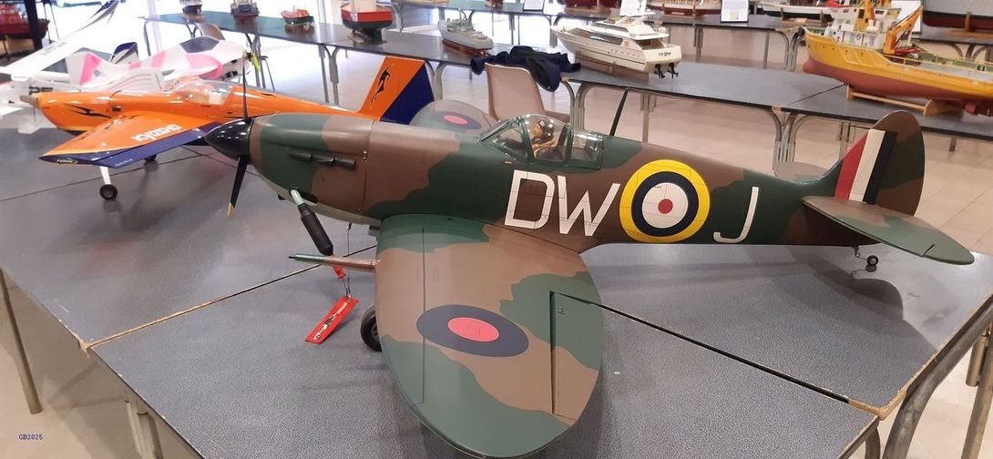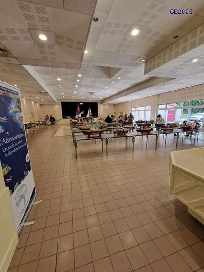 Vue d'ensemble de la salle, les avions du club, les voitures radiocommandées du club et un avion de chasse du club