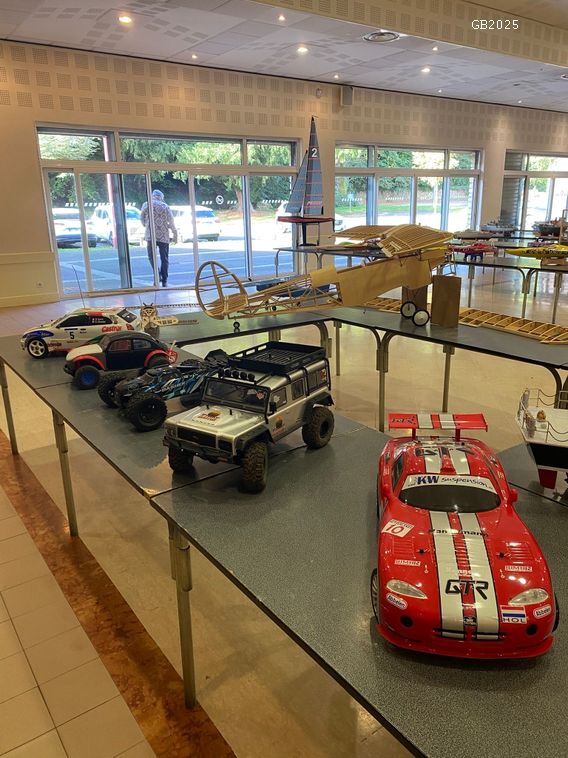 Vue d'ensemble de la salle, les avions du club, les voitures radiocommandées du club et un avion de chasse du club