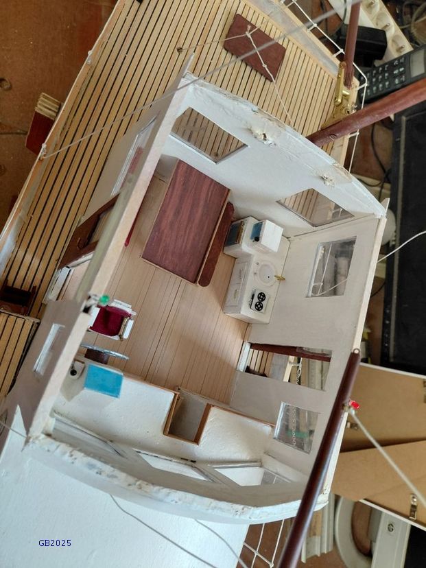 Repositionnement de la cabine avant puis montage des ensembles du pont avec ponçage de la coque et mise en place des 2 mâts.