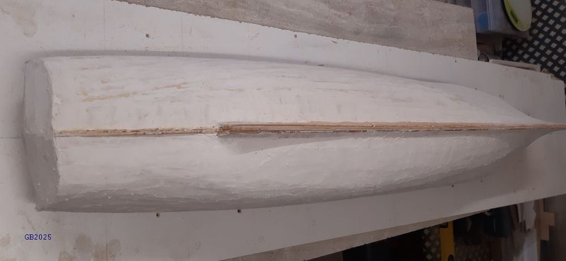 Une couche d'apprêt sur la coque ainsi que les tubes d'étambots avec hélices et les safrans sont en place avec les stabilisateurs.