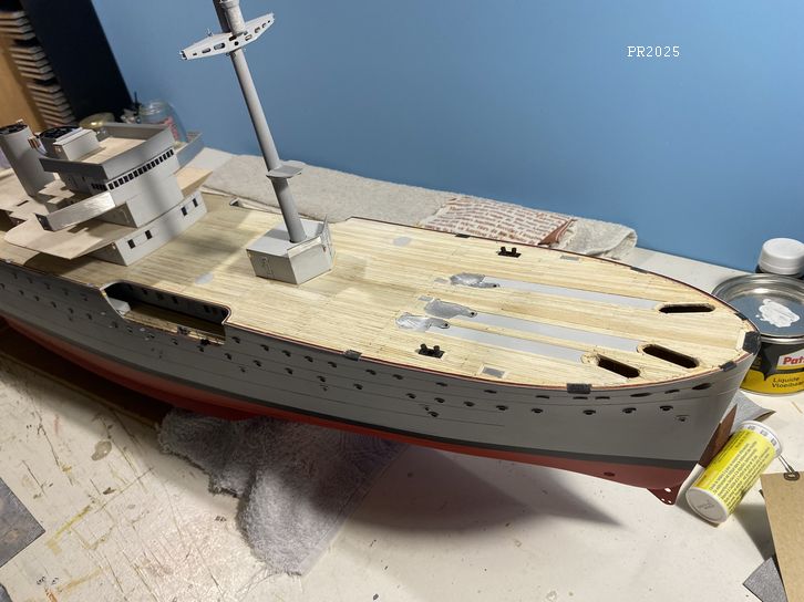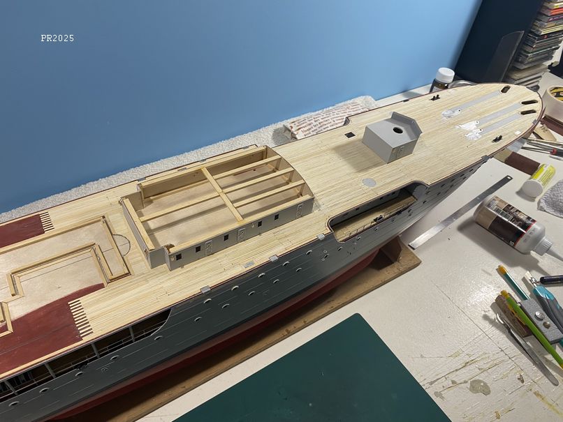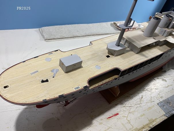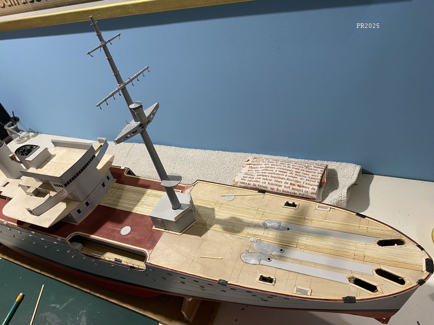 Il faut impérativement terminer le 1er pont pour coller le 2éme pont. Lattage, mise en place des bittes, des enrouleurs des câbles d'alimentation électrique